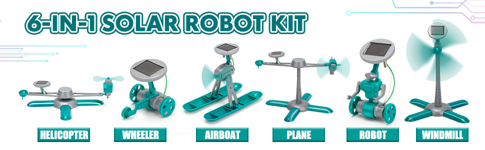 - 6-in-1 Solar Robot Kit: This solar robot kit could be built into 6 different models which include Robot, Airboat, Plane, Windmill, Helicopter, Wheel. It can move on land or water. The parts can be easily disassembled after completion of one robot.