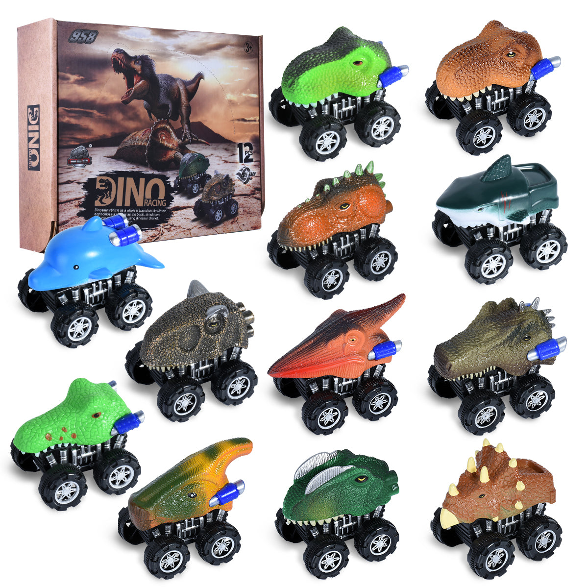 - [DINOSAUR CARS TOY 12 PACK] Total in 12. Includes: Carnotaurus, Pterosaur, Allosaurus, Tyrannosaurus, Parasaurolophus, Dilophosaurus, Triceratops, Giganotosaurus, Tyrannosaurus, Crocodile, Shark, Dolphin. This toy car can help your child learn more about dinosaur knowledge while having fun.