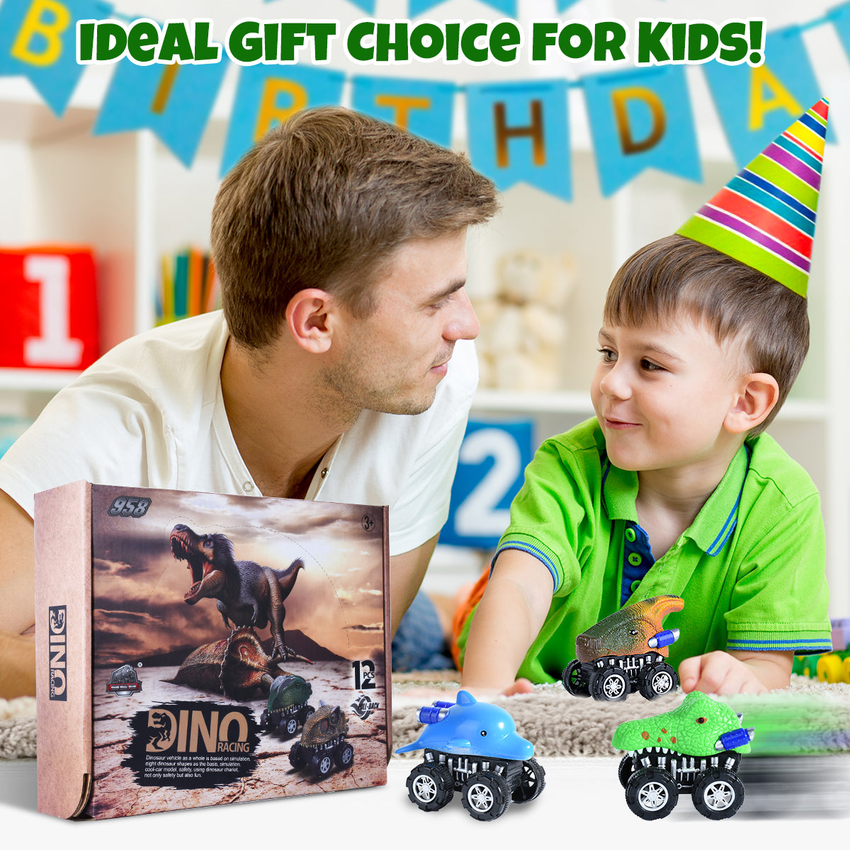 - [GREAT GIFT FOR KIDS] Designed with realistic colors and features, these dinosaur toy cars are more attractive for kids, an ideal gift for dinosaur party favors, party decoration, birthday gift, Christmas gift, theme party supplies.