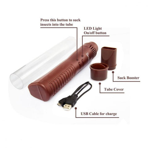 The mini bug vacuum comes with an LED light to see the bugs in dark corners, has an angled sucker to get the most suckage power out of the vacuum, comes with a tube cover so that the bugs and spiders can't crawl right back out, and measures 9.3 inches long x 2.3 inches in diameter.